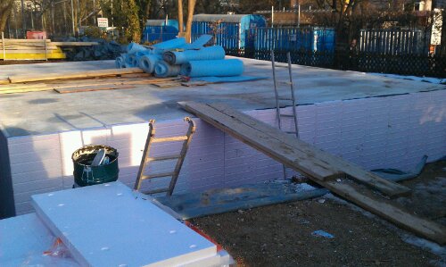 Heute wurde mit dem Auffüllen begonnen, morgen sollen die Versorgungen (Gas, Wasser, Strom und Telekom) kommen und der Rest verfüllt werden. Und schwups kanns schon weiter gehen mit dem EG. (Soweit der Plan)